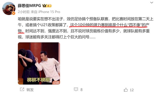 这个潜力赛意为常规时间全部结束后的8分钟,双方将会进行分为上下半场各5分钟的潜力赛,潜力赛只有各队名单中非首发国内球员才能参加。这个规定一出,也让球迷调侃起来:“能想出来这个点子的,真他娘是个人才!”