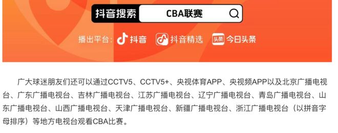 - CBA官方在12月11日晚官宣与抖音达成合作,抖音成为CBA联赛官方内容平台,将在每个比赛日免费直播精选比赛场次。...发表于: 12-12 20:40