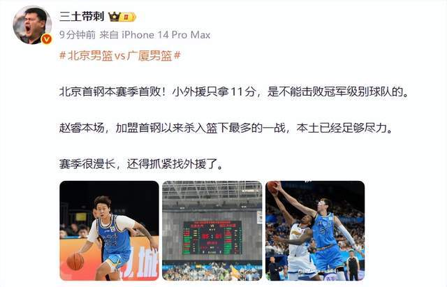 三土带刺老师则表示:北京首钢本赛季首败!小外援只拿11分,是不能击败冠军级别球队的。赵睿本场,加盟首钢以来杀入篮下最多的一战,本土已经足够尽力。赛季很漫长,还得抓紧找外援了。