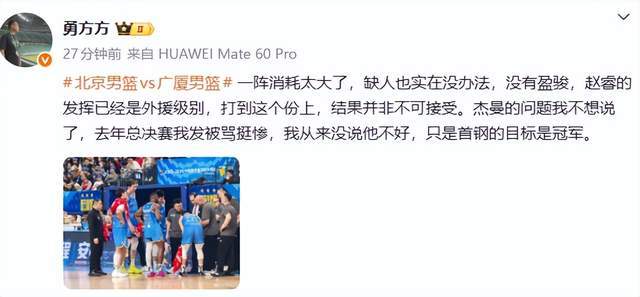 北京媒体人勇方方老师则认为:一阵消耗太大了,缺人也实在没办法,没有盈骏,赵睿的发挥已经是外援级别,打到这个份上,结果并非不可接受。杰曼的问题我不想说了,去年总决赛我发被骂挺惨,我从来没说他不好,只是首钢的目标是冠军。