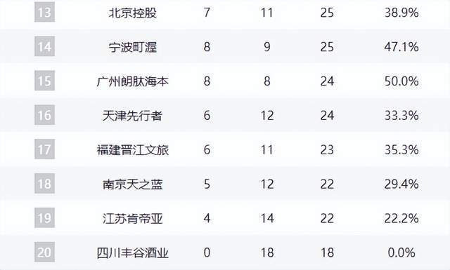 积分榜第13名是北控队,战绩与新疆队相同,为7胜11负。第14名属于宁波队,战绩为8胜9负。广州队以8胜8负的战绩排在第15名,在少赛两轮的情况下,排名较为吃亏。积分榜第16名至第20名则分别是天津队、福建队、同曦队、江苏队和四川队。江苏队本轮掀翻天津队,成功拿到赛季第4胜,而四川队则继续在积分榜垫底。