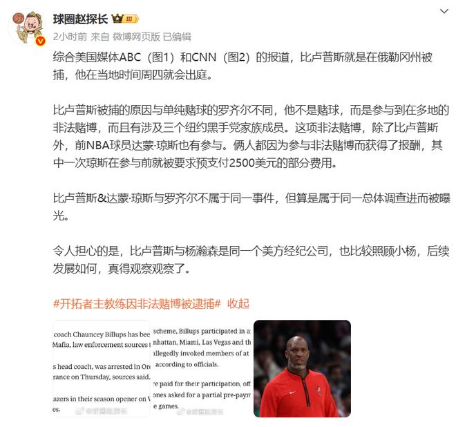 出大事了,闹翻天了。开拓者主帅比卢普斯因参与非法赌博被逮捕,该案件还涉及黑手党的非法扑克经营。比卢普斯刚执教完杨瀚森第一场常规赛比赛就出事了......目前暂时不能确定比
