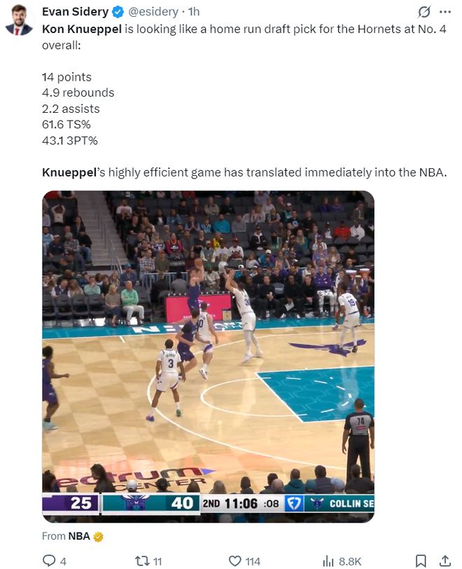 这场比赛后克努佩尔场均30.1分钟,拿到14分4.9篮板2.2助攻,真实命中率61.6%,三分命中率43.1%,他的表现越来越出色,黄蜂这个4号签并没有水。