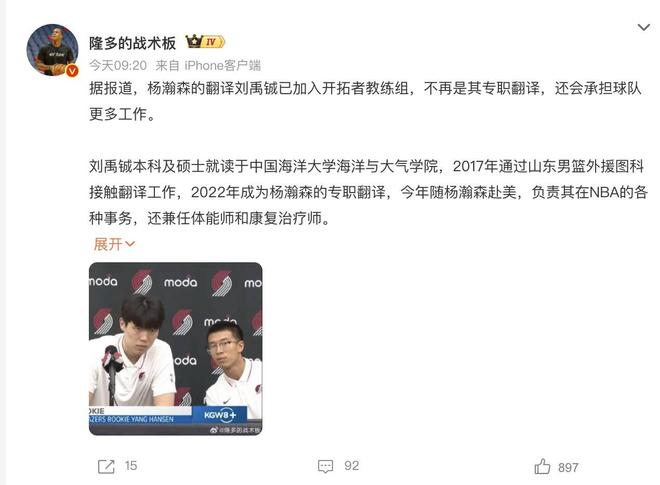 据媒体人透露,在杨瀚森这段时间闯荡NBA期间,他的翻译刘禹铖已经从杨瀚森的随身翻译,现在加入到开拓者的教练组,担任一些助理教练的工作。而从平时球迷赛事的视频大家也可以看到,刘禹铖一直帮助利拉德这位大哥训练。除此之外,刘禹铖也会在克林根训练的时候帮忙喂球,各方面的事情做的十分专业。此前他一直陪伴着杨瀚森训练,做各方面的一些康复,整体的能力是相当出色的。