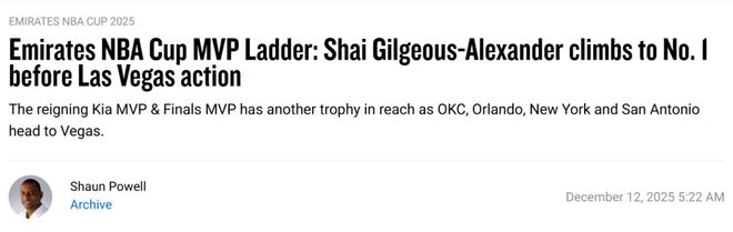 - 北京时间12月13日,随着NBA杯四强的产生,NBA官网也更新了杯赛MVP的排行榜。雷霆球星亚历山大升至第一,尼克斯球...发表于: 12-13 14:48