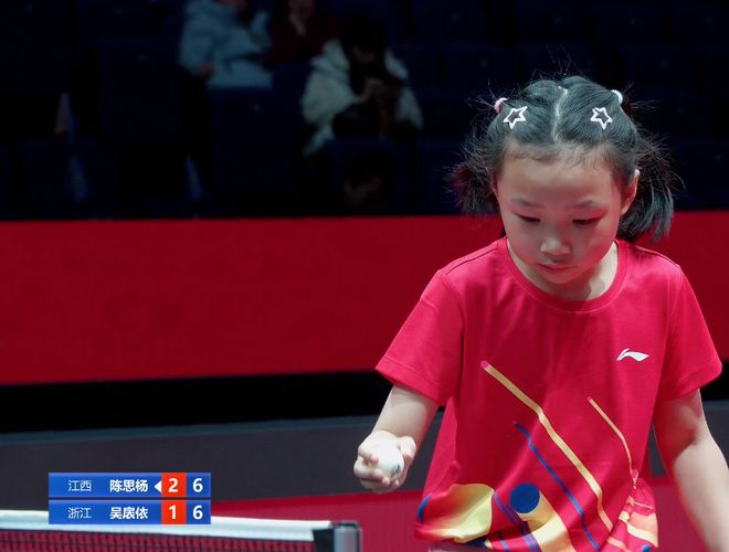 梳着两条辫子,一张萌娃脸很稚嫩,很可爱,陈思杨在赛场上却是狠辣无情,在乒超联赛总决赛期间,国少乒乓选拔赛也一并举行。陈思杨在9岁女单组和老对手吴扆依再次会师决赛,她以4比2击