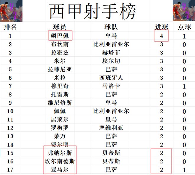 射手榜方面,姆巴佩4球领跑,拉菲尼亚,米拉,米尔,穆里奇,布坎南和拉霍兹3球并列第2。弗纳尔斯和埃尔南德斯今天各入一球后,追上维尼修斯,亚马尔等人2球刚好挤入前十。