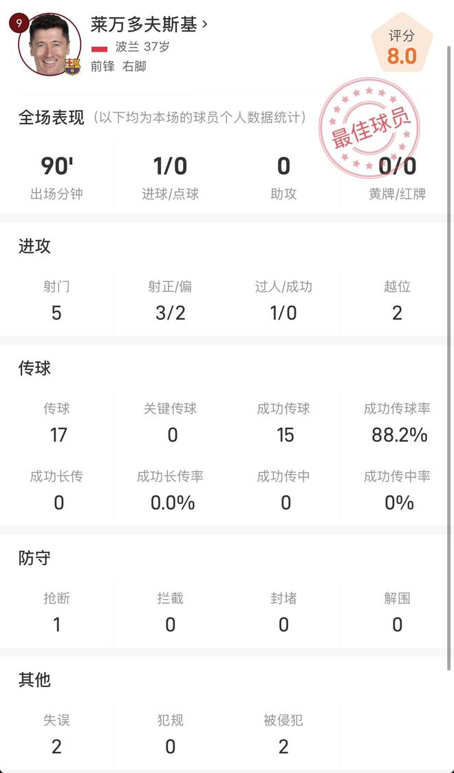 莱万vs皇家社会数据:88.2%传球成功率+破门反超比分