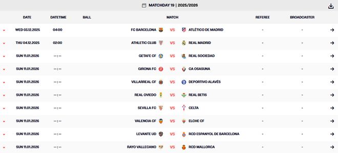 雷速体育10月30日讯 由于马德里竞技、巴塞罗那、毕尔巴鄂竞技、皇家马德里四队要在明年1月参加西班牙超级杯,为避免赛程冲突,西甲第19轮不得不提前进行。