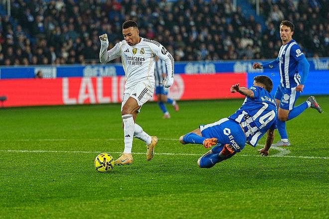 北京时间12月15日凌晨,西甲第16轮,阿拉维斯主场对阵皇家马德里。比赛中。图源:视觉中国比赛开始后,皇马占据着主动,上半场第24分钟,姆巴佩左路内切突破起脚兜射破门,皇马1-0阿拉维
