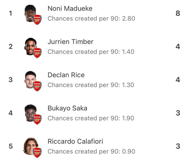 萨卡季初受伤后,马杜埃凯迅速证明自身价值。尤其对比马丁内利近期状态起伏,其能左能右的特点显著丰富了阿尔特塔的进攻选择。数据显示,马杜埃凯目前以0.8的预期助攻值领跑全队,场均2.4次成功过人仅次于埃泽,8次创造机会更是队内第二名的两倍。其2.8的场均机会创造数据已接近萨卡上赛季3.0的水准。
