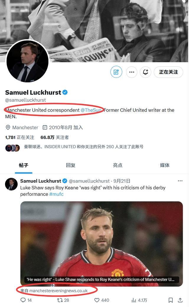卢克赫斯特的个人账号简介已经改为:“太阳报曼联跟队记者,前曼晚首席曼联跟队。”