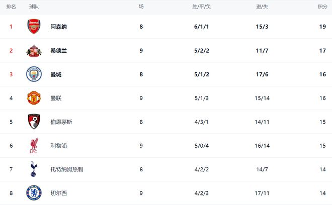 在积分榜上,阿森纳以19分高居榜首。桑德兰这匹大黑马升到了第2名,总积分是17分。第3的是曼城,拿到16分。曼城比桑德兰少踢1场。曼联赢球之后,排名升到了第4,积分和曼城相同。而利物浦依然是15个积分,掉到了第5名。伯恩茅斯以15分排名第6。第7的是热刺,拿到14分。切尔西也是14分,排名第8。