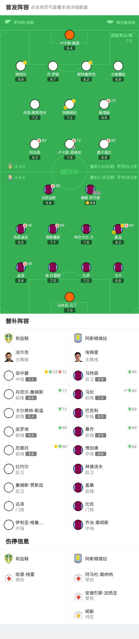 第75分钟,摩根-罗杰斯任意球直接破门完成双响,维拉2-1利兹联