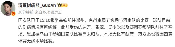 社媒原文:“国安队已于15:10乘坐高铁前往郑州,备战本周五客场与河南队的比赛。球队目前的伤病情况有所缓解,此前受伤的达万、张源、吴少聪以及郑图罗都随队前往了客场,恩加德乌由于参加国家队比赛尚未归队,本场大概率缺席,范双杰也将因四黄停赛无缘本场比赛。”