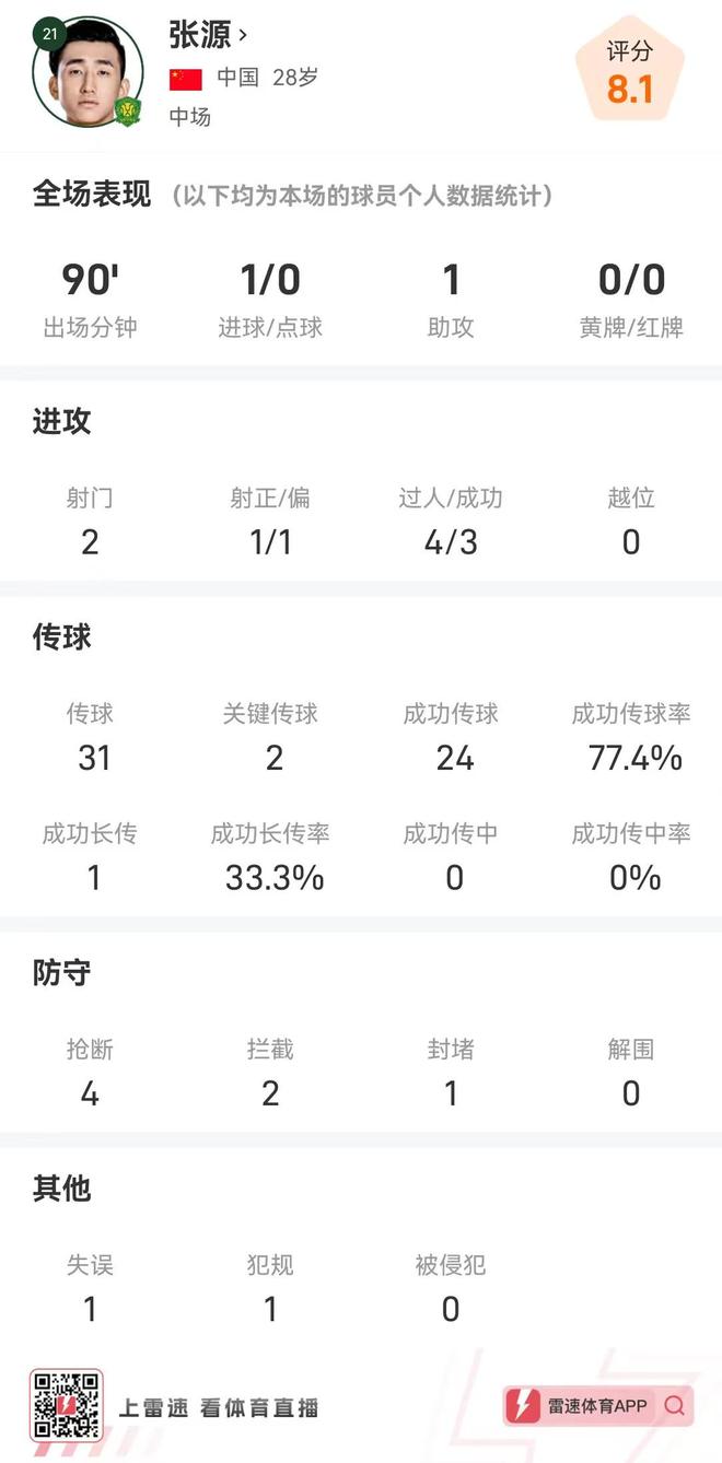 张源全场数据:一传一射独造两球,防守端表现同样不俗