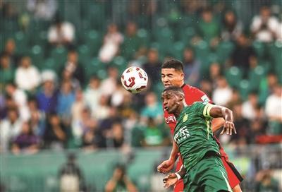 北京国安队球员法比奥(下)和上海海港队球员蒋光太在比赛中争顶。新华社记者 胡星宇摄